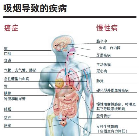 烟草几乎可以损害人体的所有器官,而戒烟则能够有效阻止或延缓吸烟相关疾病的进展。研究发现,戒烟1年后冠心病患者死亡的危险大约可减少一半,而且随着戒烟时间的延长会继续降低,戒烟15年后,冠心病患者死亡的绝对风险将与从未吸烟者相似;戒烟和防止二手烟暴露是防治COPD的最重要的手段,戒烟是证实的能够有效延缓肺功能进行性下降的唯一办法;戒烟还可以减少脑卒中、外周血管性疾病、肺炎及胃、十二指肠溃疡的发病率和死亡率。戒烟不仅是治疗各种吸烟相关疾病的重要组成部分,还可减少周围人群尤其是家人和同事二手烟暴露的危害。