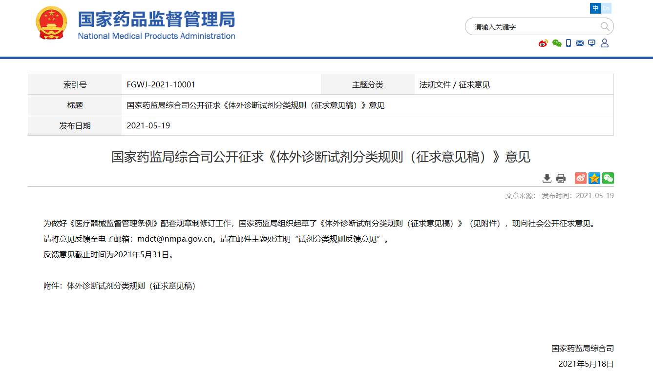 国家药监局于5月19日发布了《体外诊断试剂分类规则(征求意见稿)》(见附件),对体外诊断试剂做出了新的标准,细胞因子检测试剂及配套耗材议价结果待国家药监局正式发布相关文件后确定最终结果并公示。