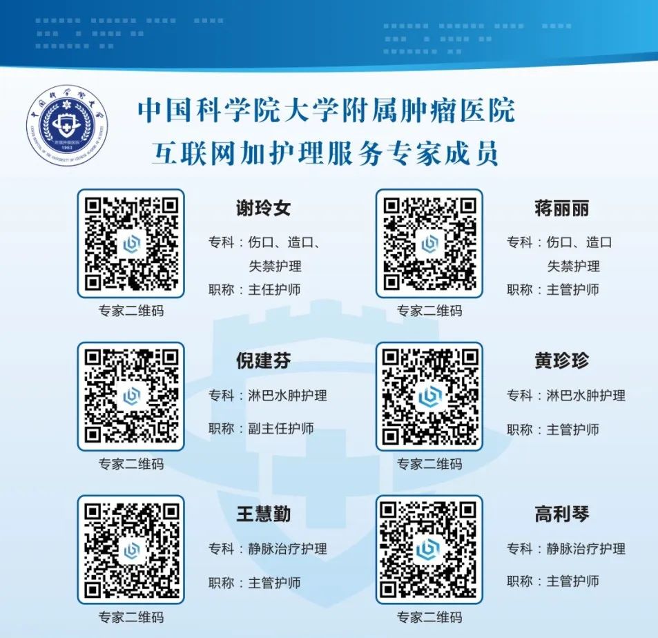 2019年6月,国科大肿瘤医院正式加入浙江省互联网医院平台。2019年8月国科大肿瘤医院上线静脉护理、造口伤口护理、淋巴水肿治疗相关互联网护理门诊,6位省级护理专家与患者“面对面”。2020年3月国科大肿瘤医院线上护理专家库又添新成员,12位护理专家强势入驻。