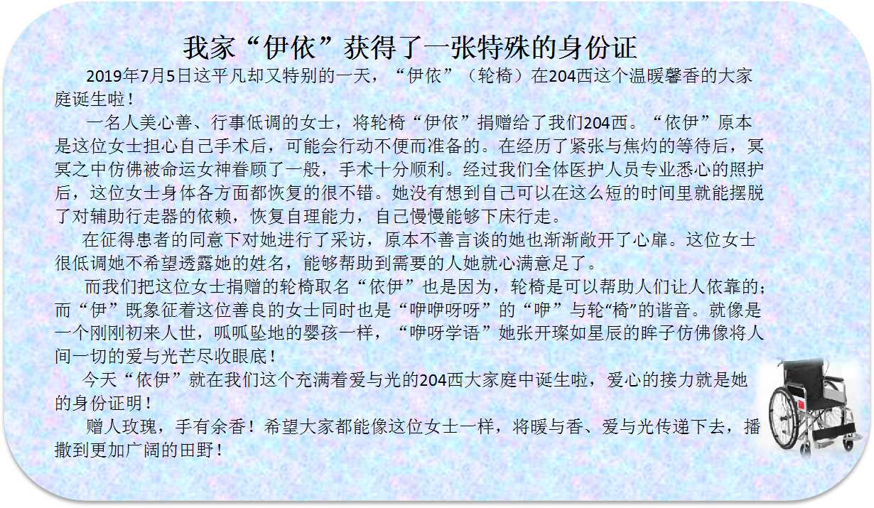 而我们把这位女士捐赠的轮椅取名“伊依”也是因为,轮椅是可以帮助人们让人依靠的;而“伊”既象征着这位善良的女士同时也是“咿咿呀呀”的“咿”与轮椅的“椅”的谐音。就像是一个刚刚初来人世,呱呱坠地的婴孩一样,“咿呀学语”她张开璨如星辰的眸子仿佛像将人间一切的爱与光芒尽收眼底!今天“伊依”就在我们这个充满着爱与光的204西大家庭中诞生啦,爱心的接力就是她的身份证明!