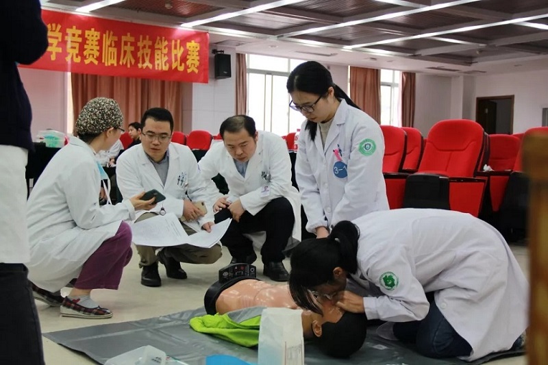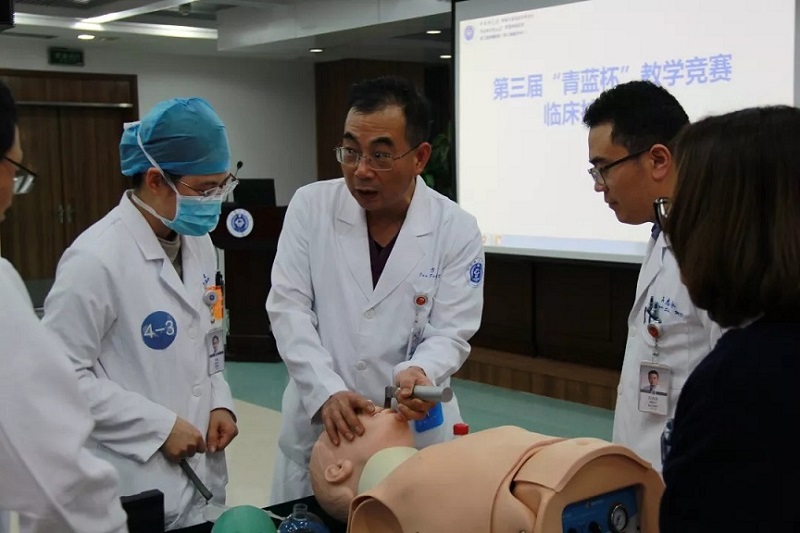 本届临床技能竞赛由麻醉科基地方军主任、外科基地李德川主任、内科基地宋正波副主任担任专家评委,并邀请相关学科的骨干师资担任考核评委。竞赛项目为心肺复苏、气管插管两项操作,各专业基地经初赛遴选出4名参赛学员,其中两人参加心肺复苏,另外两人参加气管插管临床技能决赛项目,核医学科基地只有1名在培医师,心肺复苏项目可邀请一名外援完成,气管插管项目独立完成。