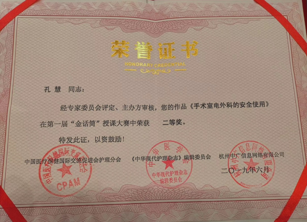 本届“金话筒”授课大赛主旨是提升护士在健康教育及带教中的重要价值,展示其优秀的授课技能,促进广大护理人员的交流与合作。大赛分为网上评比和专家评审两个环节,历经3个月的激烈角逐,全国295家单位热情组织、1029位护理同仁积极参与。经最终评审,第一届“金话筒”授课大赛落下帷幕,我院手术室护士孔慧的作品《手术室电外科的安全使用》过五关,斩六将,荣获全国二等奖。