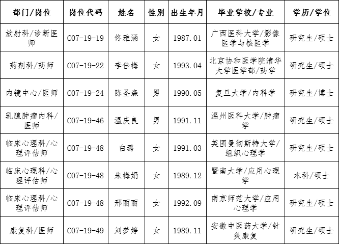 根据《浙江省肿瘤医院公开招聘人员公告(2019年第三批)》,经报名、资格审查、面试、体检和考核,现确定下列人员为我单位拟聘用人员并公示如下: