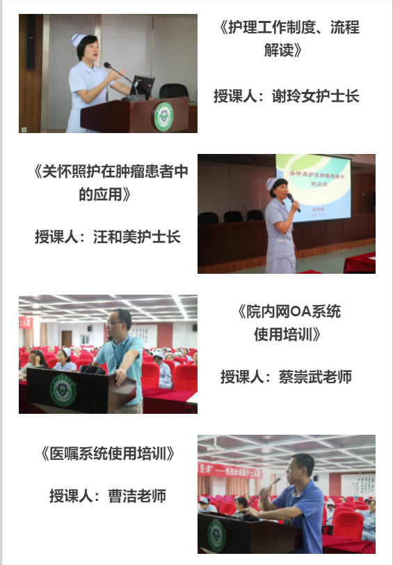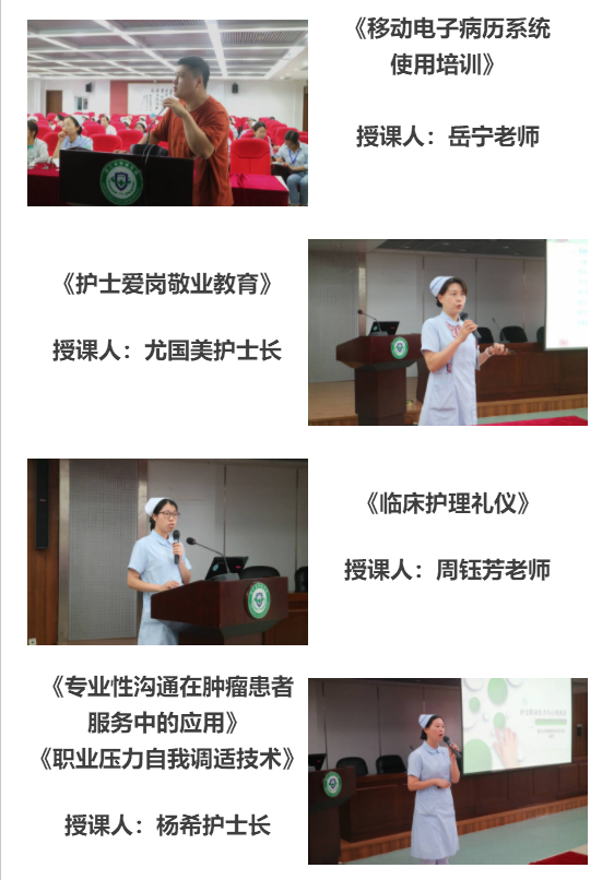 此次培训内容涉及医院概况介绍、护理风险的防范、护理相关法律法规解读、护理核心制度、护士礼仪规范、护患沟通技巧、信息系统使用等多方面,理论内容紧密结合临床实践,利于新入职护士从学生到临床护理人员的角色转变、为其胜任工作岗位奠定良好的基础。在新护士群体中反响热烈。