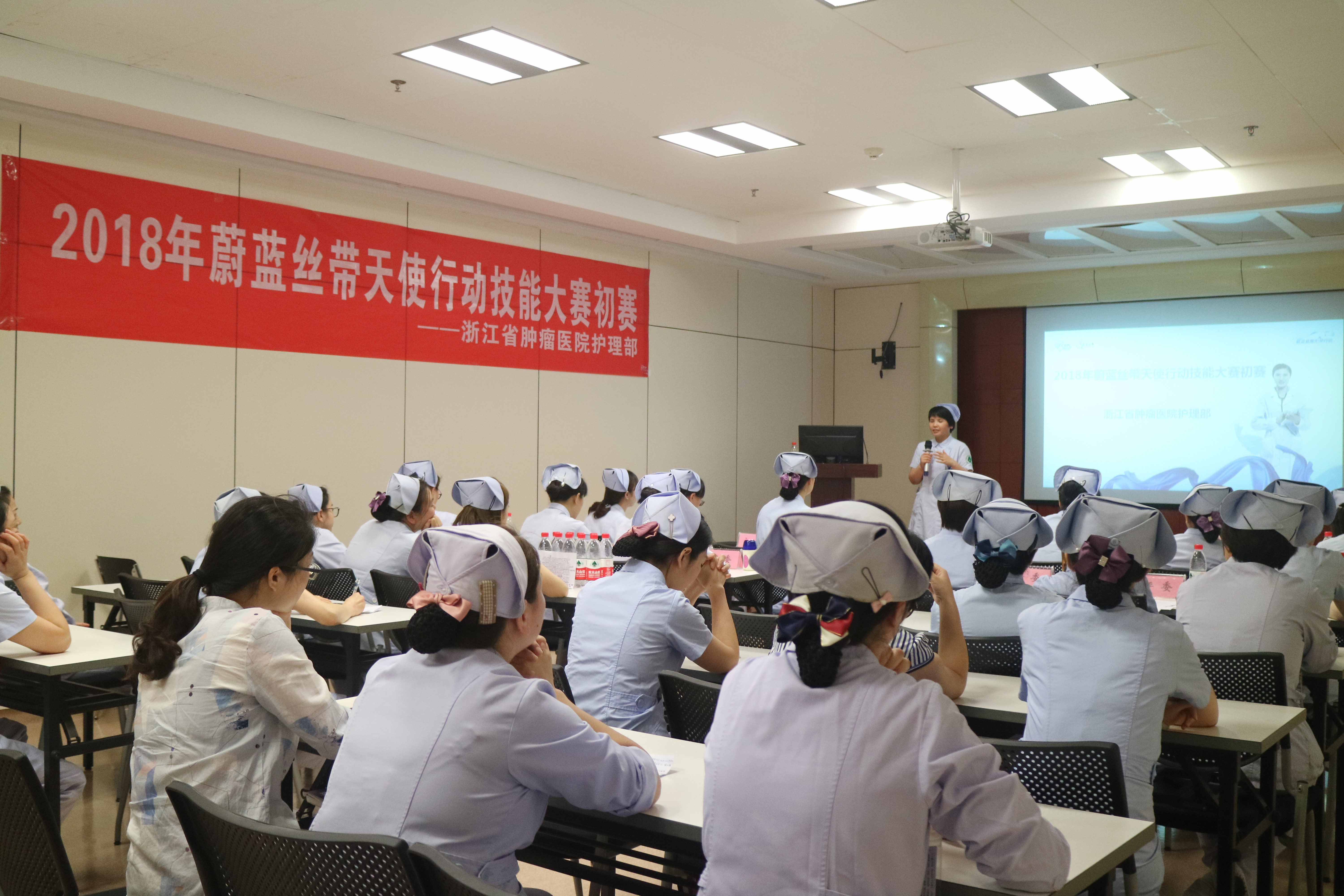 6月26日,由浙江省肿瘤医院护理部组织、院癌痛专科小组精心筹划的“2018年蔚蓝丝带天使行动技能大赛”在2号楼1楼药剂科示教室正式拉开序幕。本次比赛分为初赛和决赛两轮进行。来自外科、放疗科、综合护理单元等各个大科选拔的16位选手参与比赛。