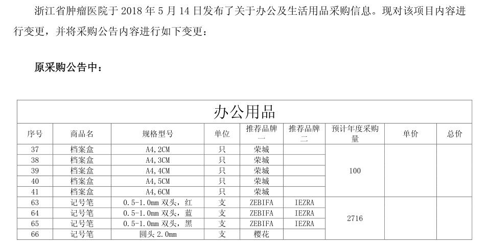 浙江省肿瘤医院关于办公及生活用品采购信息变更说明