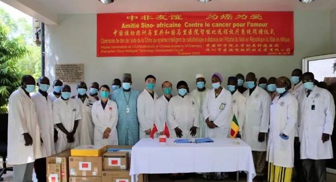 2020年10月9日,在马里医院放疗中心,受中国科学院大学附属肿瘤医院(浙江省肿瘤医院)委托,第26批援马里医疗队蒋益华队长代为向马里医院捐赠中马智能化远程放疗系统,蒋队长与马里医院院。