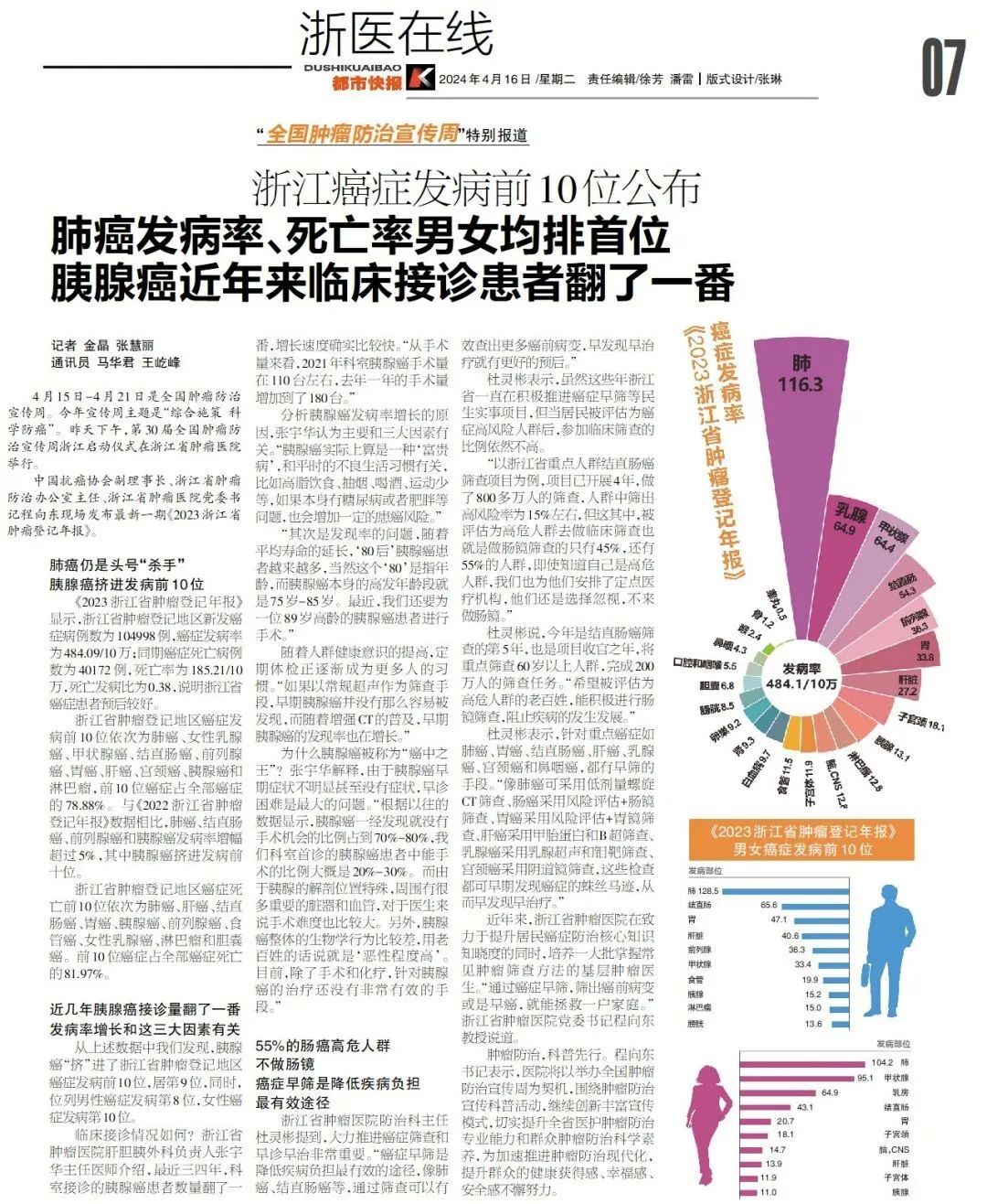 《2023浙江省肿瘤登记年报》显示,浙江省肿瘤登记地区新发癌症发病病例数为104998例,癌症发病率为484.09/10万