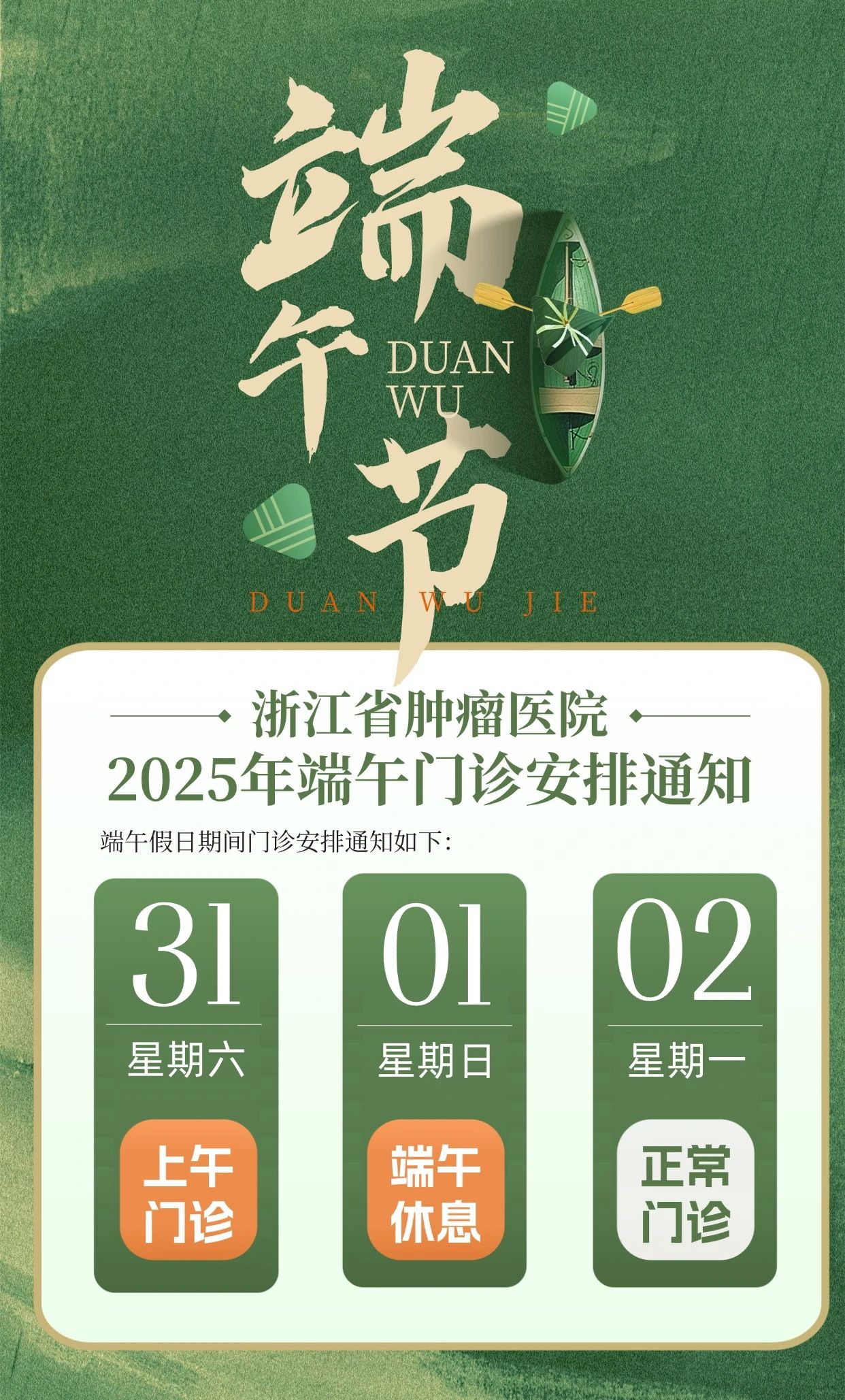 根据《国务院办公厅关于2025年部分节假日安排的通知》(国办发明电〔2024〕12号)精神,结合医院实际情况,2025年我院端午期间门诊安排如下: