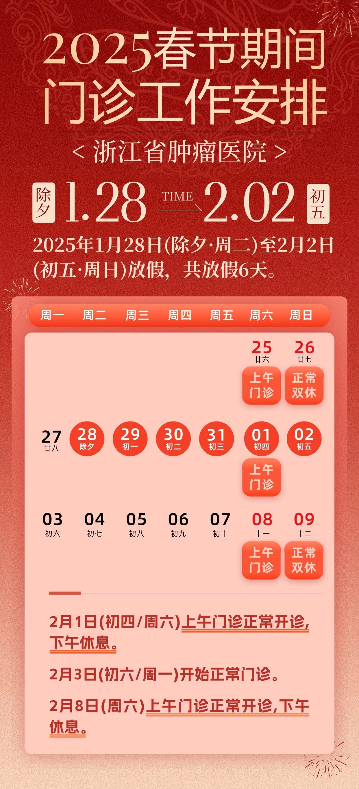 根据《国务院办公厅关于2025年部分节假日安排的通知》(国办发明电〔2024〕12号)精神,结合医院实际情况,2025年我院春节期间门诊安排如下: