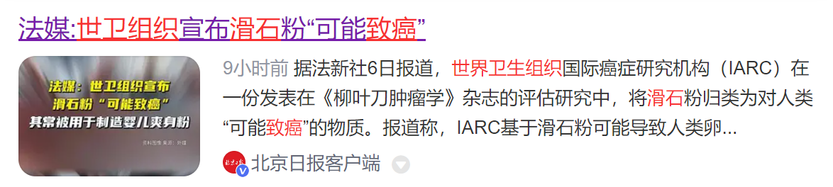 就在前几天,世界卫生组织国际癌症研究机构(IARC)发表在《柳叶刀·肿瘤学》杂志的评估研究中,将滑石粉归类为2A类致癌物。