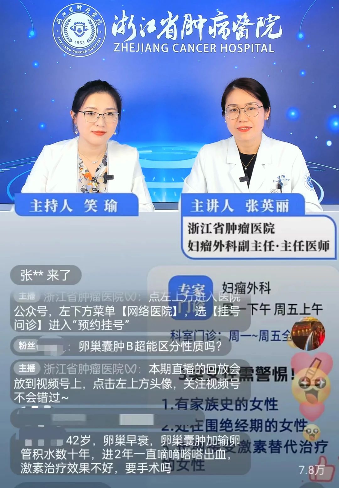 “妈妈患卵巢癌, 我什么时候要做基因检测?” “预防卵巢癌, 每年要做哪些检查?” “确诊卵巢癌,可以怎么治疗?” …… 卵巢癌作为“妇癌之王” 严重威胁着女性健康 该如何预防和治疗? 我院妇瘤外科主任医师张英丽 近日在名医直播间进行了详细科普 一起回顾一下医生怎么说