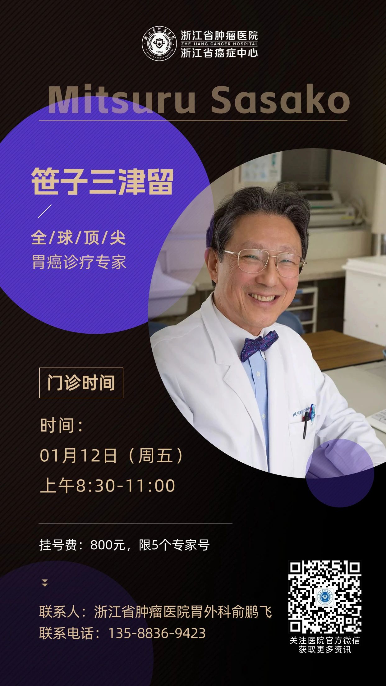 受我院党委书记程向东教授的邀请,原国际胃癌协会主席、日本胃癌协会主席、全球顶尖胃癌诊疗专家——笹子三津留(Mitsuru Sasako)教授将于近期访问我院。 2024年1月12日上午,笹子三津留教授将在我院坐诊,为广大胃癌患者提供诊疗服务。一个上午的门诊时间仅接受5名患者预约,每位患者都将得到非常高质量的咨询和建议。