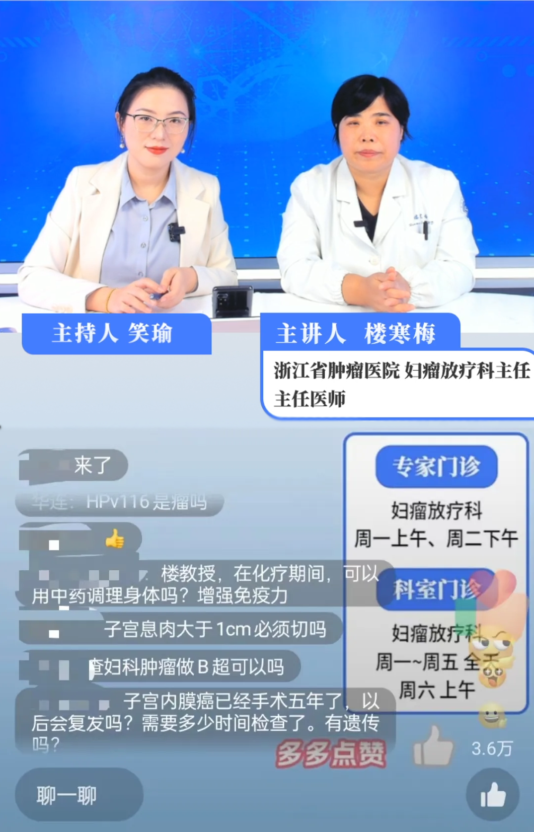 宫颈癌、子宫内膜癌、卵巢癌 被称为妇科三大恶性肿瘤 近年来不仅发病率呈上升趋势 也引起越来越多女性的关注 那么,对于它们 哪些高危人群要特别注意? 妇科要进行哪些检查可以早发现? 此前,我院妇瘤放疗科主任医师楼寒梅 在名医直播间进行了详细科普