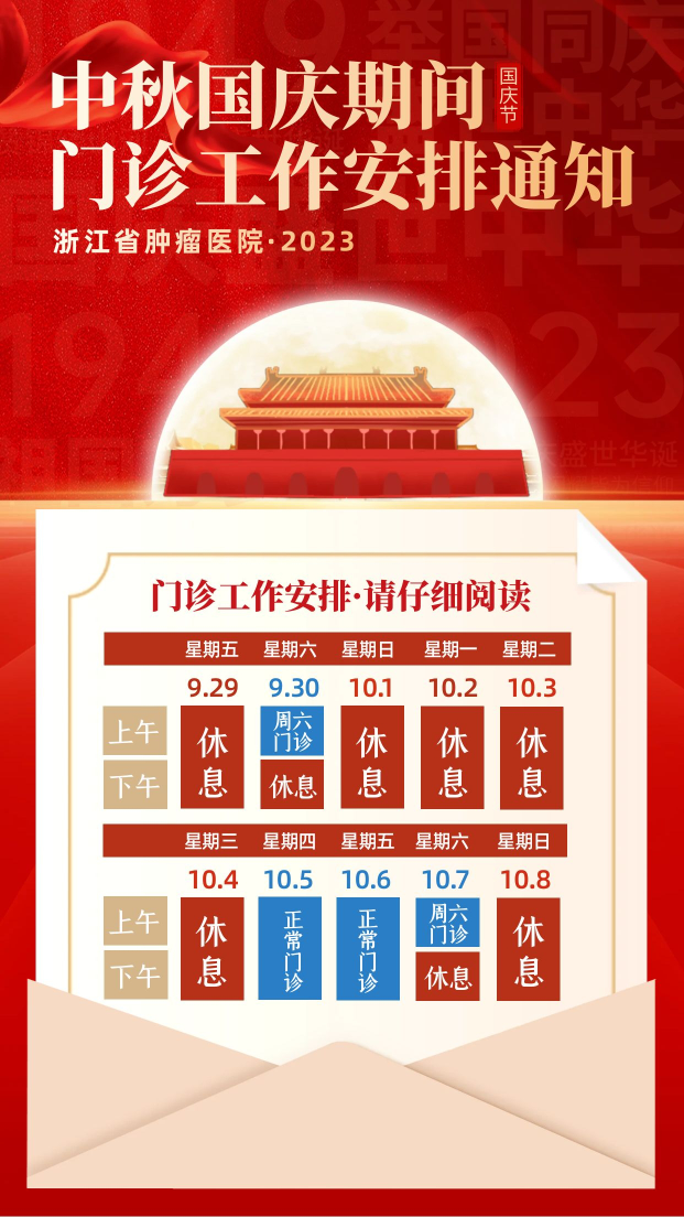 根据《国务院办公厅关于2023年部分节假日安排的通知》(国办发明电〔2023〕16号)精神,结合医院实际情况,2023年我院中秋、国庆期间门诊安排如下: 2023年9月29日(周五)至10月4日(周三)放假,其中9月30日(周六)上午门诊正常开诊,下午放假。 2023年10月5日(周四)、10月6日(周五)正常门诊,10月7日至8日正常双休,其中10月7日(周六)上午门诊正常开诊,下午休息。