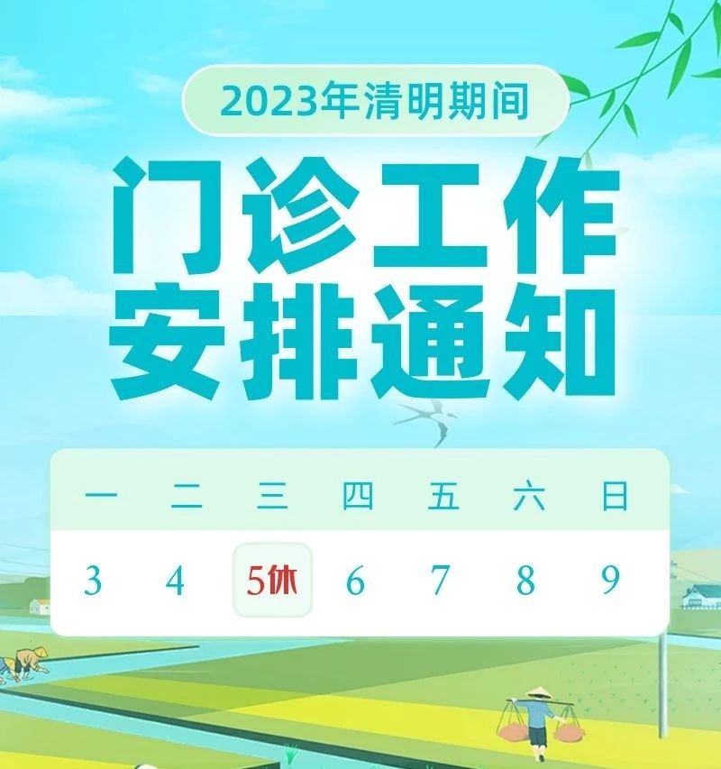根据《国务院办公厅关于2023年部分节假日安排的通知》(国办发明电〔2023〕16号)精神,结合医院实际情况,2023年我院清明期间门诊工作安排如下: 2023年4月5日(周三)放假1天,门诊停诊,其他时间正常开诊。