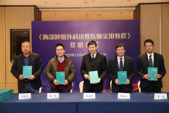 为提升社会各界对胸部肿瘤的关注与认识,同时向公众更新肿瘤诊疗最新进展,在近日举办的 2022年浙江省食管癌规范化巡讲杭州站和2022年浙江省医师协会胸外科医师年会上,浙江省肿瘤医院胸外科陈奇勋主任(主编)、蒋友华主任(副主编)、刘金石主任(副主编)、曾剑主任(副主编)以及浙江大学医学院附属第一医院胸外科胡坚主任(副主编)举行了《胸部肿瘤外科进修医师实用教程》签赠仪式,并围绕中国胸部肿瘤患者群体的需求、诊疗现状与未来期望等话题进行了深入交流。