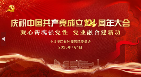 7月1日,浙江省肿瘤医院举办“凝心铸魂强党性 党业融合建新功”庆祝中国共产党成立104周年大会。省卫生健康委党委副书记郑家淮、医院全体党员领导干部、党建内设部门正副主任、群团组织负责人、党支部委员、在职及退休党员代表、民主党派及无党派人士代表等参加本次会议。
