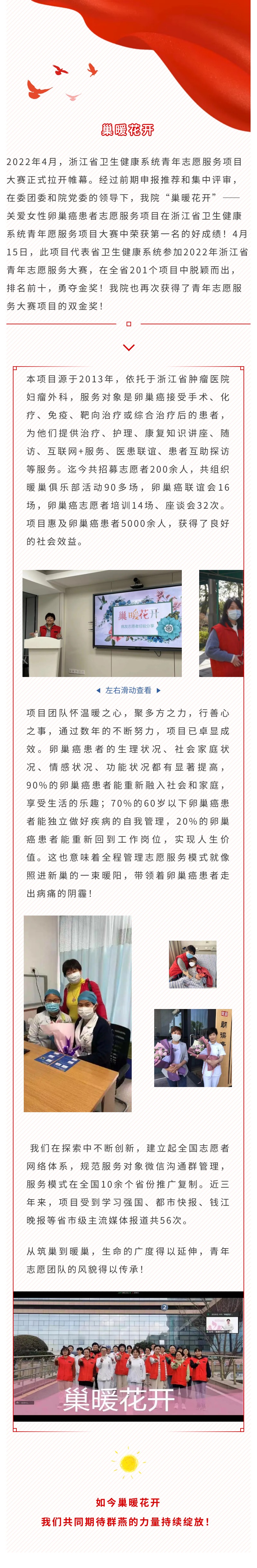 首页- 党群工作- 基层团建- 团建工作- 巢暖花开——关爱女性卵巢癌患者志愿服务项目获得2022年共青团浙江省委、浙江省卫生健康系统青年志愿服务项目大赛双金奖