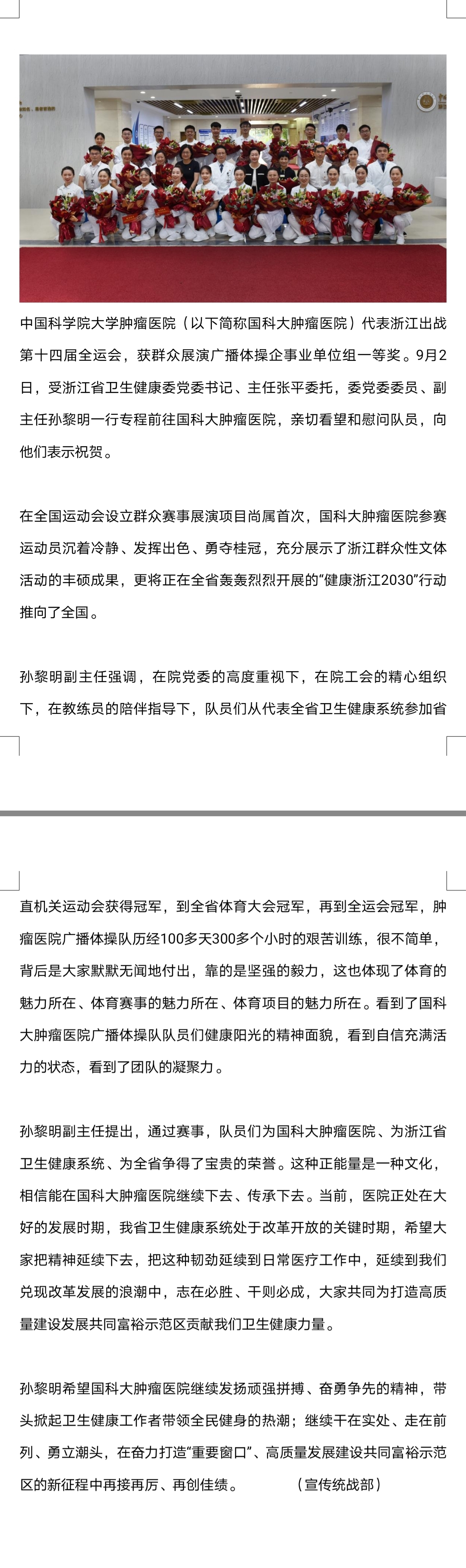 浙江省卫生健康委领导赴我院慰问 祝贺国科大肿瘤医院广播体操队在第十四届全运会夺冠