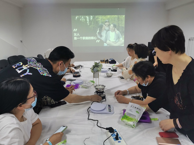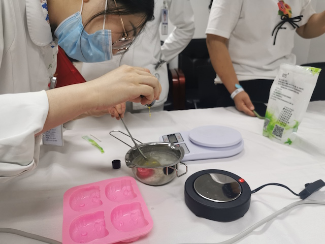 活动第二部分是由植物精油疗法培训讲师刘颖,给大家介绍了目前在情绪管理中流行的精油芳香疗法。同时会议室内工作人员将橘子精油熏香点燃,刹那间,整个会议室里弥漫着清新、舒爽的橘子气味,大家都闭着眼睛享受着这迷人的气味,整个人感到神清气爽,心情舒畅。刘老师讲课结束后,她开始指导制作精油皂,学员们一个个像参加科学实验一样兴奋和认真,半小时候后精油皂在磨具里慢慢诞生了,大家欣赏着散发着淡淡香味的精油皂,喜悦心情溢于言表。