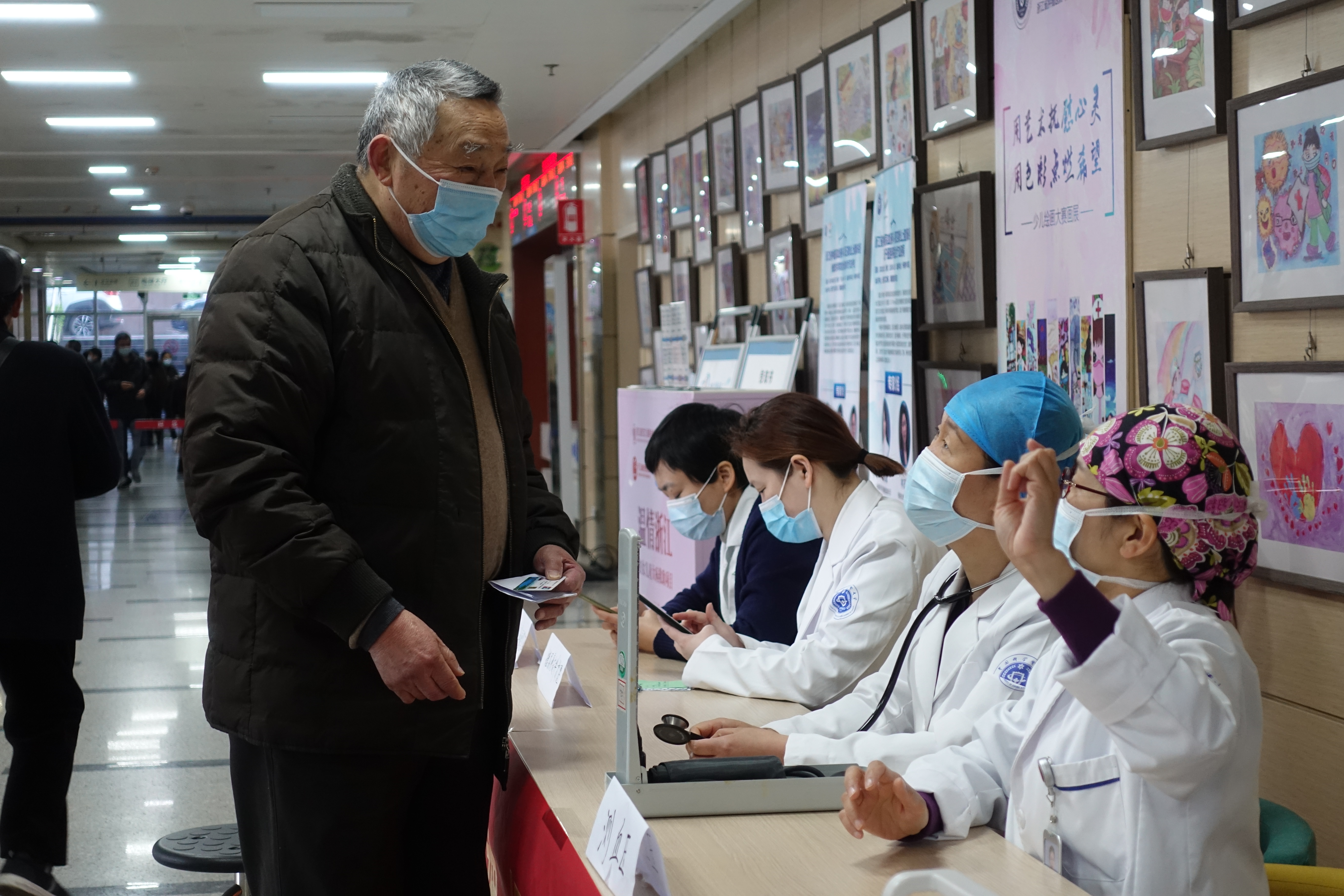 3月4号上午,在住院部2号楼一楼大厅,人流熙熙攘攘,一抹鲜红的横幅格外醒目,义诊活动当天开设了现场咨询、导医、导诊、测血压等多项志愿服务。