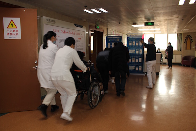 8:15演习开始了,A护士查房发现13床床头柜冒烟并有明火,她立即呼救,然后去临近的消防设备窗拿取灭火器来灭火,B护士听到呼叫后立即拨打2119报告,并按下了消防报警按钮。此时广播里开始进行消防演习通告,闻讯赶来的医护人员开始主动分工,A医生切断了电源,并立即冲进于起火房间临近的治疗室,转移贵重的床边B超机。B医生也紧跟其后,取出治疗室里的小氧气瓶。家政阿姨连忙将走廊上的大氧气筒进行转移。其他几位护士分头通知病房内的患者和家属转移,大家都取出毛巾捂住口鼻,猫着腰有序的向两边安全出口进行转移。此时,安全出口处已有护士手举信号棍,示意转移方向。4床患者因术后行动不便无法转移,医护人员协作下,使用轮椅将患者安全转移。此时,消控室工作人员也已经赶到起火病房,并拉出水管进行“灭火”。整个演练过程紧凑,不慌乱,医护协作相当好。最后,护士长进行人员清点,病区主任宣布演习结束。