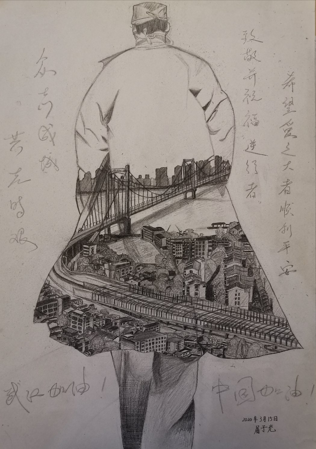 屠子充小朋友一幅题为“众志成城、共克时艰”的素描作品让我们眼前一亮。画中一位白衣战士逆行奔赴武汉战场,解救这座英雄的城市,武汉长江大桥衬托的“医者”背影益显挺拔。而他的父亲就是一位进入隔离病房,奋战“疫”线的勇士——213东病区护士长。在屠子充的眼里,所有逆行的背影,都是最美的风景。头颈外科毛晓春医生的丈夫正在滨江收治点抗击疫情,女儿“小棉袄”俞馨儿通过画笔向英雄爸爸表达了思念。她盼望着父亲能早日凯旋归来。