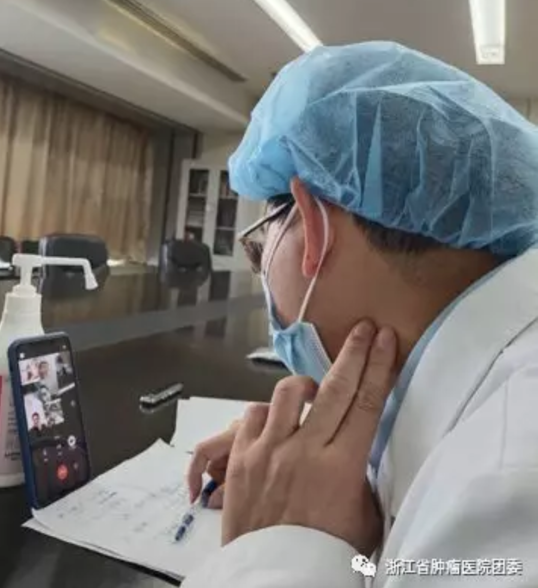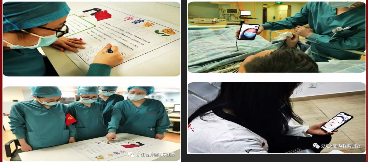 215东病区青年文明号7名青年医护人员对35名全喉切除术后的肿瘤患者采用微信视频连线咨询和网络线上问诊,利用在线视频、语音通话、图文咨询等方式,在215东病区示教室针对全喉切除气管造瘘患者对于新冠肺炎的特殊防护措施、疫情期间复查注意事项、心理疏导、食管发音练习指导,以及疾病相关知识咨询等进行了一场跨越空间的答疑活动。