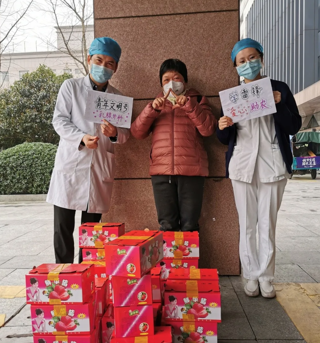 乳腺外科国家级青年文明号集体自从新冠疫情爆发以来,一直心系患者,通过微信平台、QQ平台、直播平台已陆续开展了10余次线上直播答疑活动。青年医护人员主动担当,在志愿服务中坚守答疑平台,为5000余名乳腺癌患者答疑解惑。同时开展“爱心助农”活动,通过号召购买一位乳腺癌患者家中种植的草莓,为她解决了部分因疫情滞销的难题。