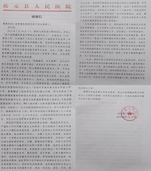 在此期间,朱书记一行与庆元县人民医院党委书记管廷勇,院长林军及相关科室负责人进行座谈。管廷勇作了 2019 年国科大肿瘤医院结对帮扶工作汇报,他代表庆元县人民医院,将感谢信交到朱书记手中,衷心地感谢国科大肿瘤医院对该院一年来实施的健康帮扶工作,有效推动了肿瘤疾病的规范化、同质化治疗,全面提升了其肿瘤综合治疗能力,为当地百姓就医提供了实实在在的便利。