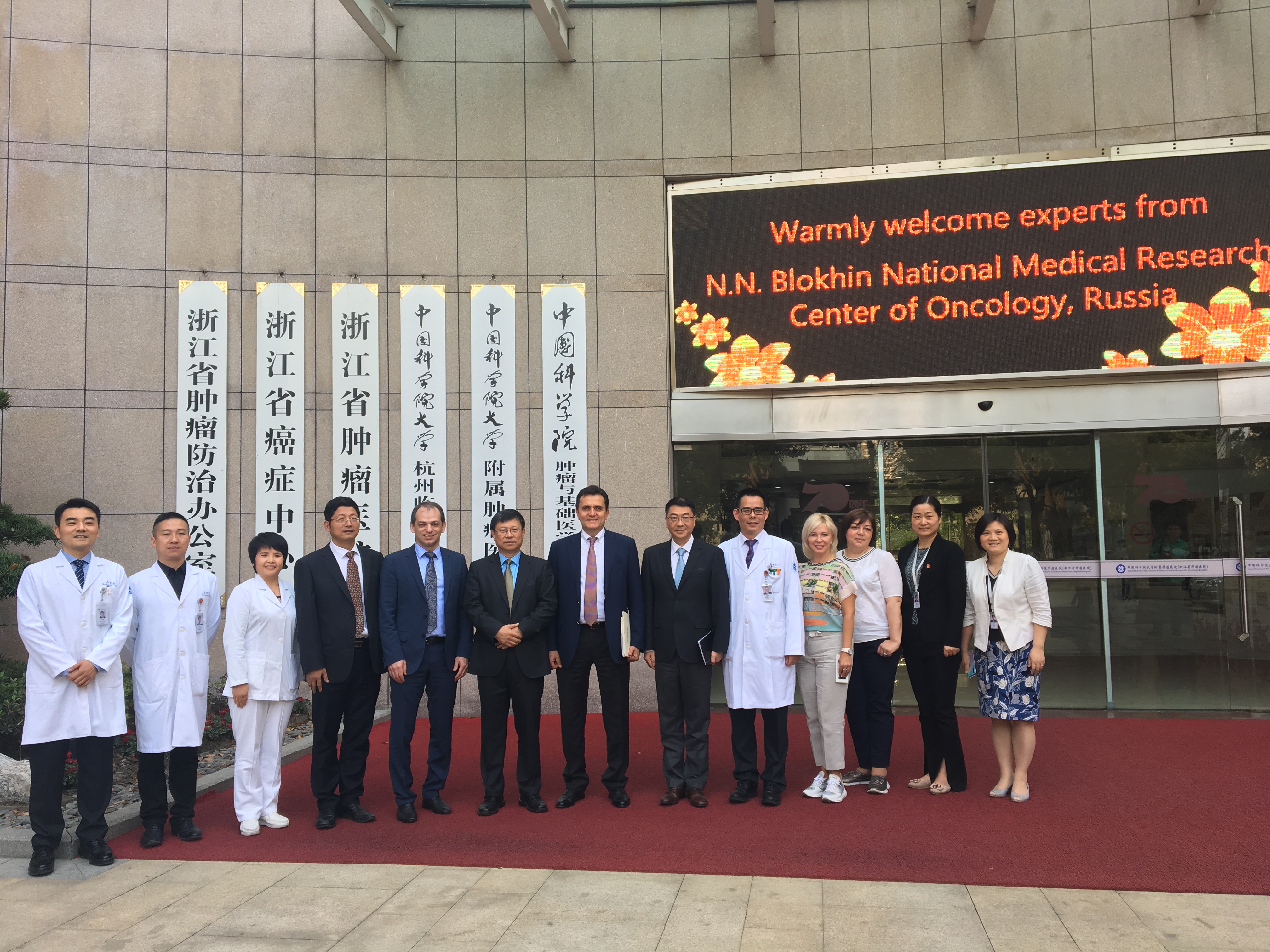 2019年10月21日,俄罗斯布洛欣国家肿瘤医学研究中心主任斯蒂利迪·伊万·索克拉托维奇、副主任亚历山大·彼得罗夫斯基一行4人在浙江省对外科技交流中心沈晓莉女士的陪同下前来我院访问,并与我院签署合作备忘录。党委书记于恩彦、常务副院长陈明、副院长邵国良、院长助理王晓稼以及部分职能科室科长出席了签约仪式。仪式由邵国良副院长主持。