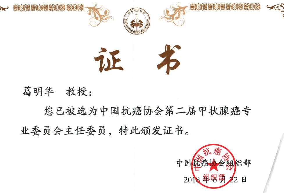 葛明华副院长任中国抗癌协会甲状腺癌专业委员会主任委员