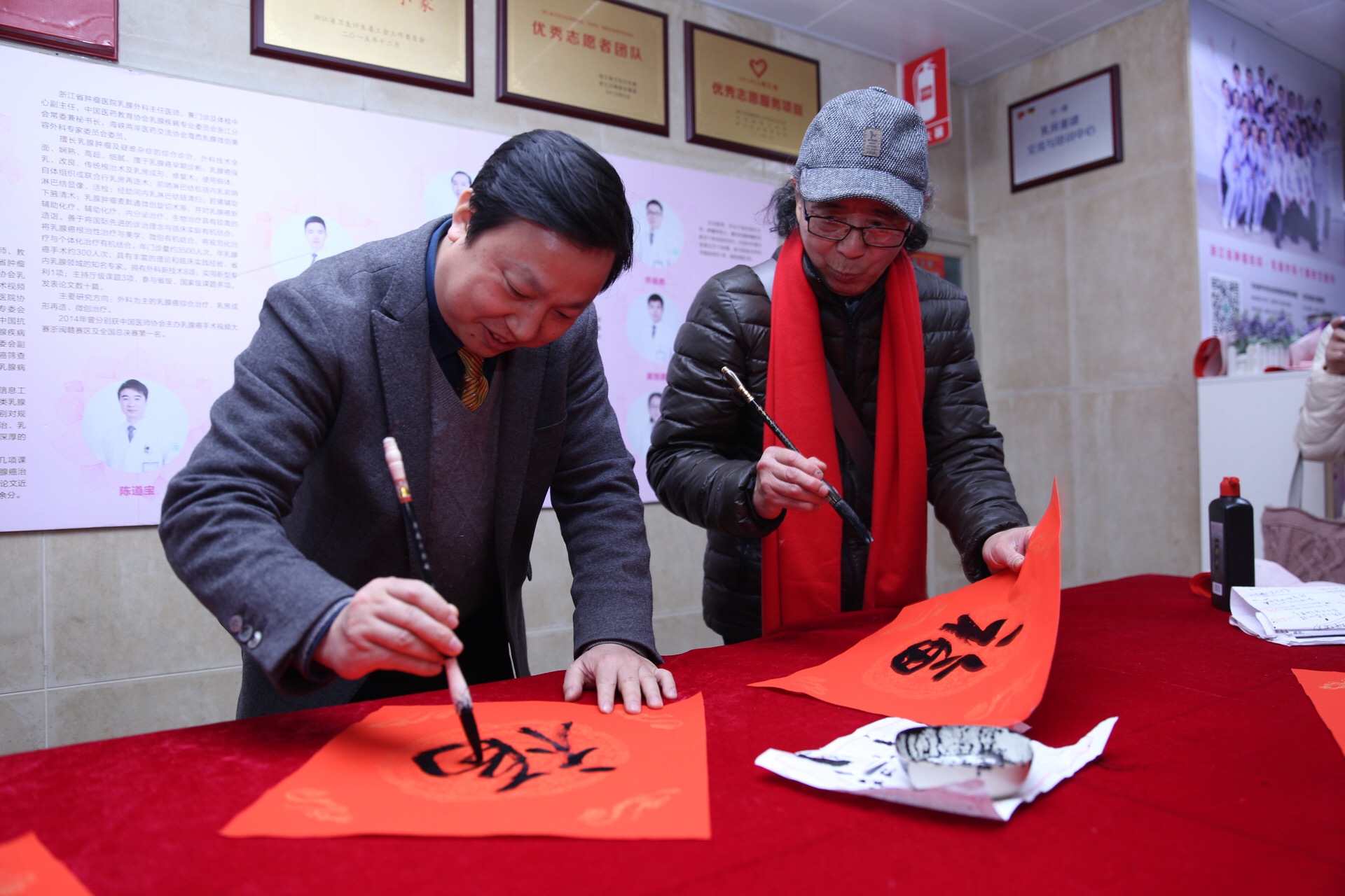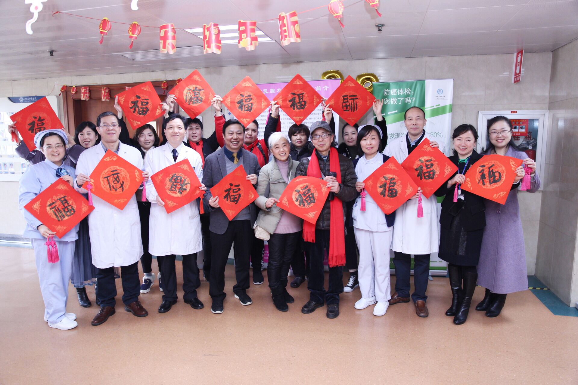 春将至,福自来。走进浙江省肿瘤医院乳腺外科病区,首先映入眼帘的便是那一幅幅字体各异的“福”字。在火红的斗方上,绚烂得如同病友那充满着康复愿望。正在执笔的老者,挥毫落纸如云烟,笔酣墨饱,力透纸背。