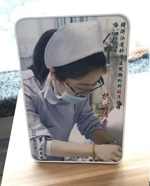 上周五,一个寻常的夏日的傍晚,浙江省肿瘤医院胸外科护士张萍像往常一样在下班前巡视病房。当她来到12床前时,张萍发现前几日肺癌术后的曲大伯已经出院了,被褥叠得四四方方,雪白的床单上摆着一幅精致的水晶桌摆,上书一行簪花小楷:赠予张护师,护心传香。