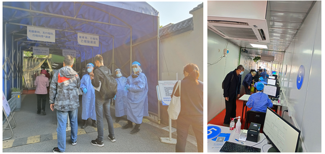 10:00医院大门外核酸采样点。为方便无48小时核酸阴性报告的患者和家属,五一假期间医院南大门东侧,在总务、信息的配合下,快速搭建了用于核酸采样的简易板房。今天是启用的第一天,物资、标识、流程、人员全部到位,解决了很多患者和家属的困扰,窗口语音播报:“请您佩戴好口罩,间隔1米以上距离,检测结束尽快离开采样区”,这就是我“门”的速度和力量。“疫情之下,患者来院就诊不容易,我们尽可能把流程都帮他们安排好,节省他们为了48小时核酸报告跑去外院采集再返回本院就诊的时间,省去他们一些麻烦。”李倩护士长说。