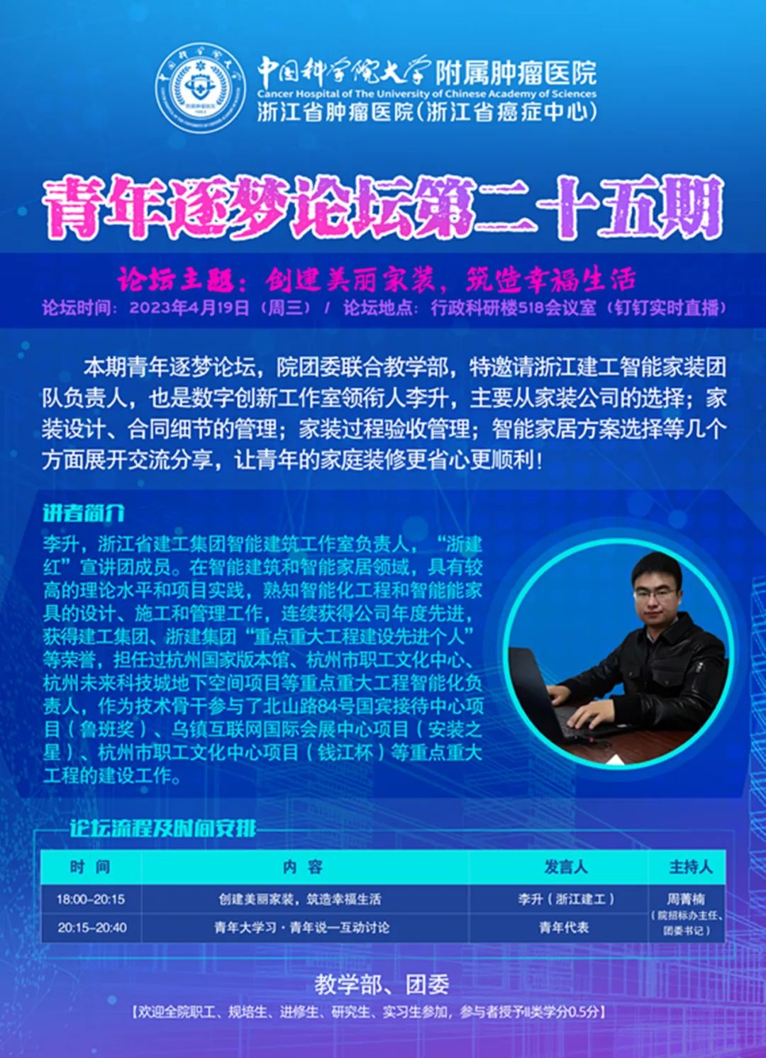 为提升青年生活幸福感,助力青年家庭把握装修主动权,省心省力住新家,4月19日晚,主题为“创建美丽家装,筑造幸福生活”的第二十五期青年逐梦论坛在行政楼518会议室如期召开。院团委联合教学部,特邀请浙江建工智能家装团队负责人、数字创新工作室领衔人李升老师,为大家讲解了一堂细致生动的家装知识科普课。